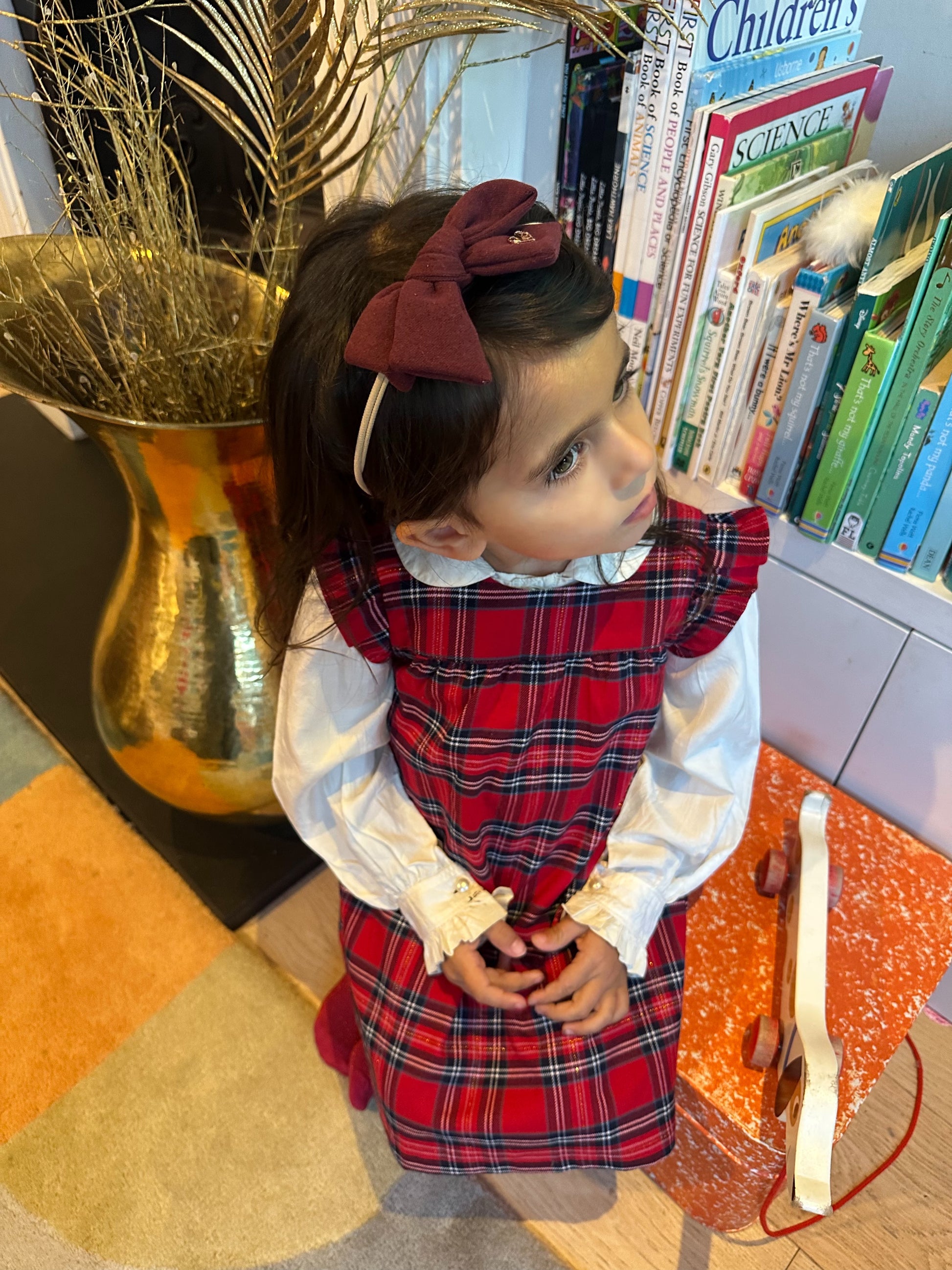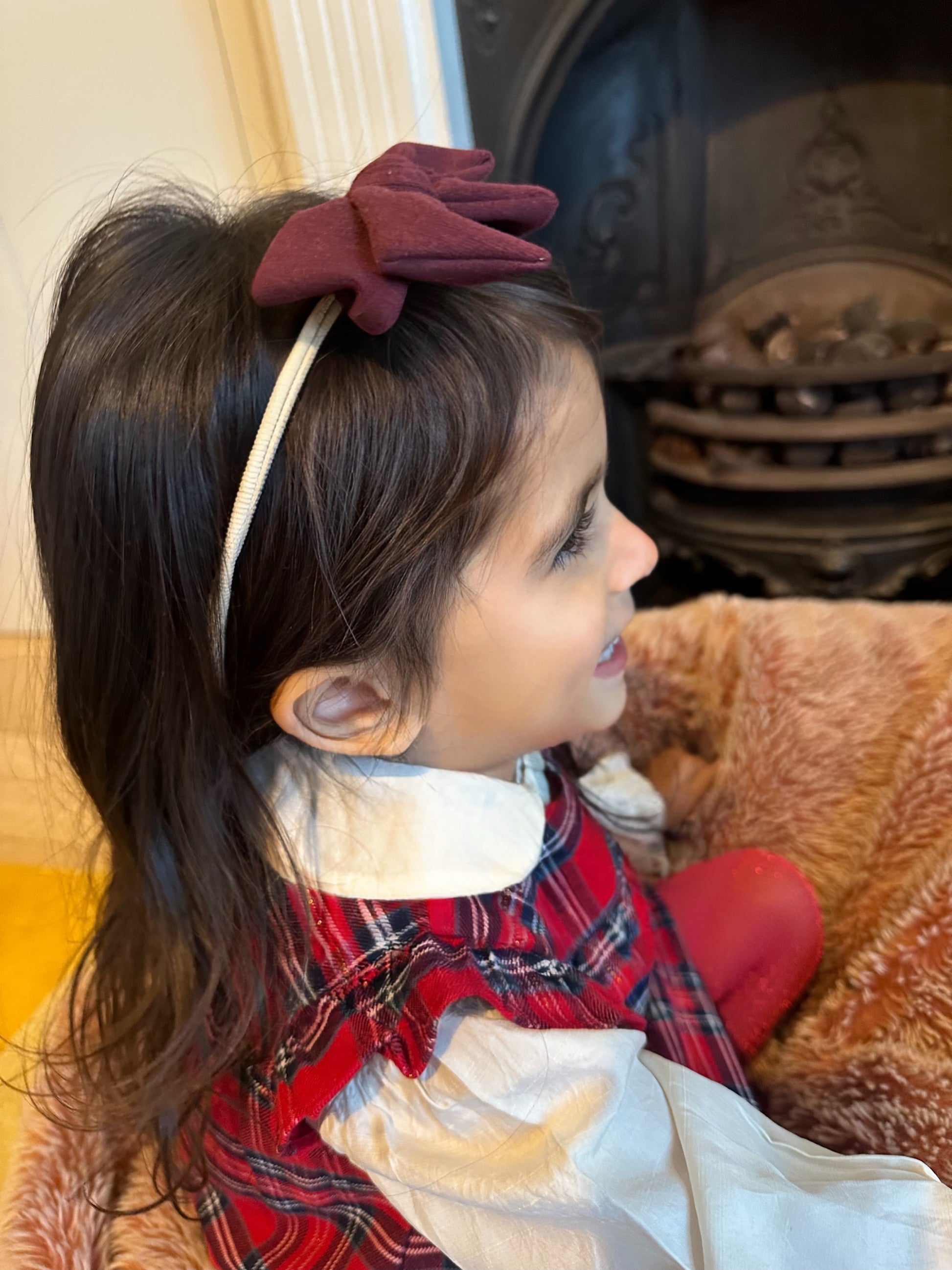 Each bow sits delicately on a soft, stretchy band made for gentle comfort, making Mia ideal for Christmas outings, festive parties, family photoshoots, cosy days out and special occasions. The timeless bow silhouette adds instant charm, while the warm seasonal tones bring a chic, mini-fashionista flair to every look — from knits and rompers to party dresses.