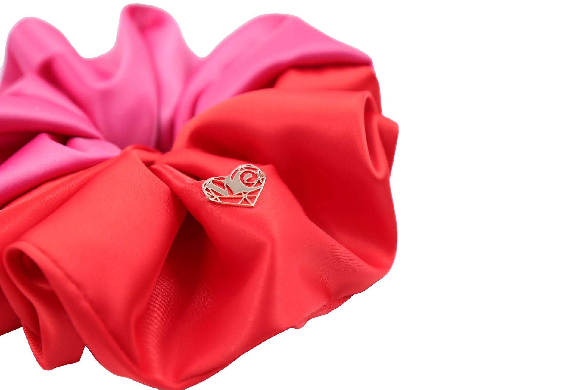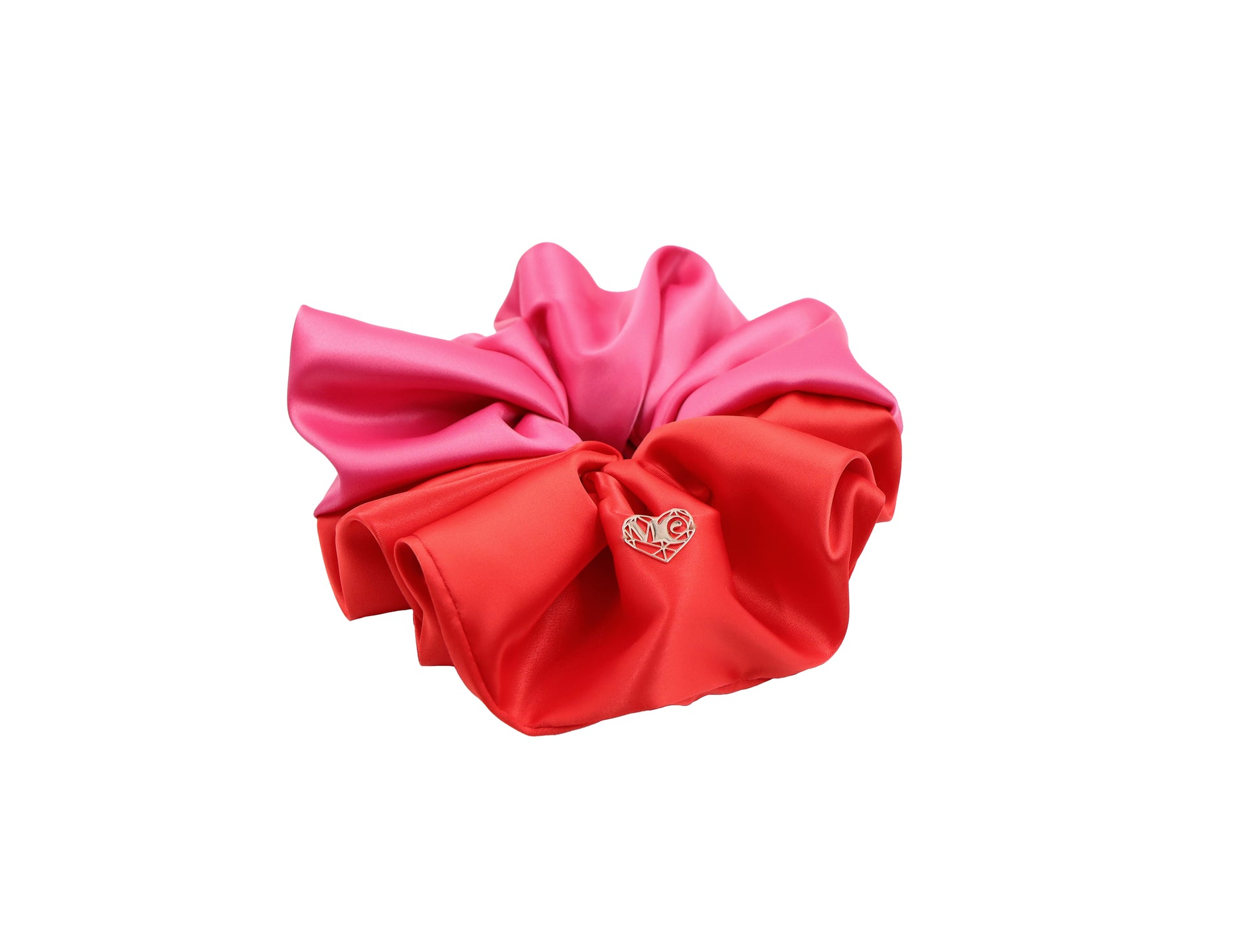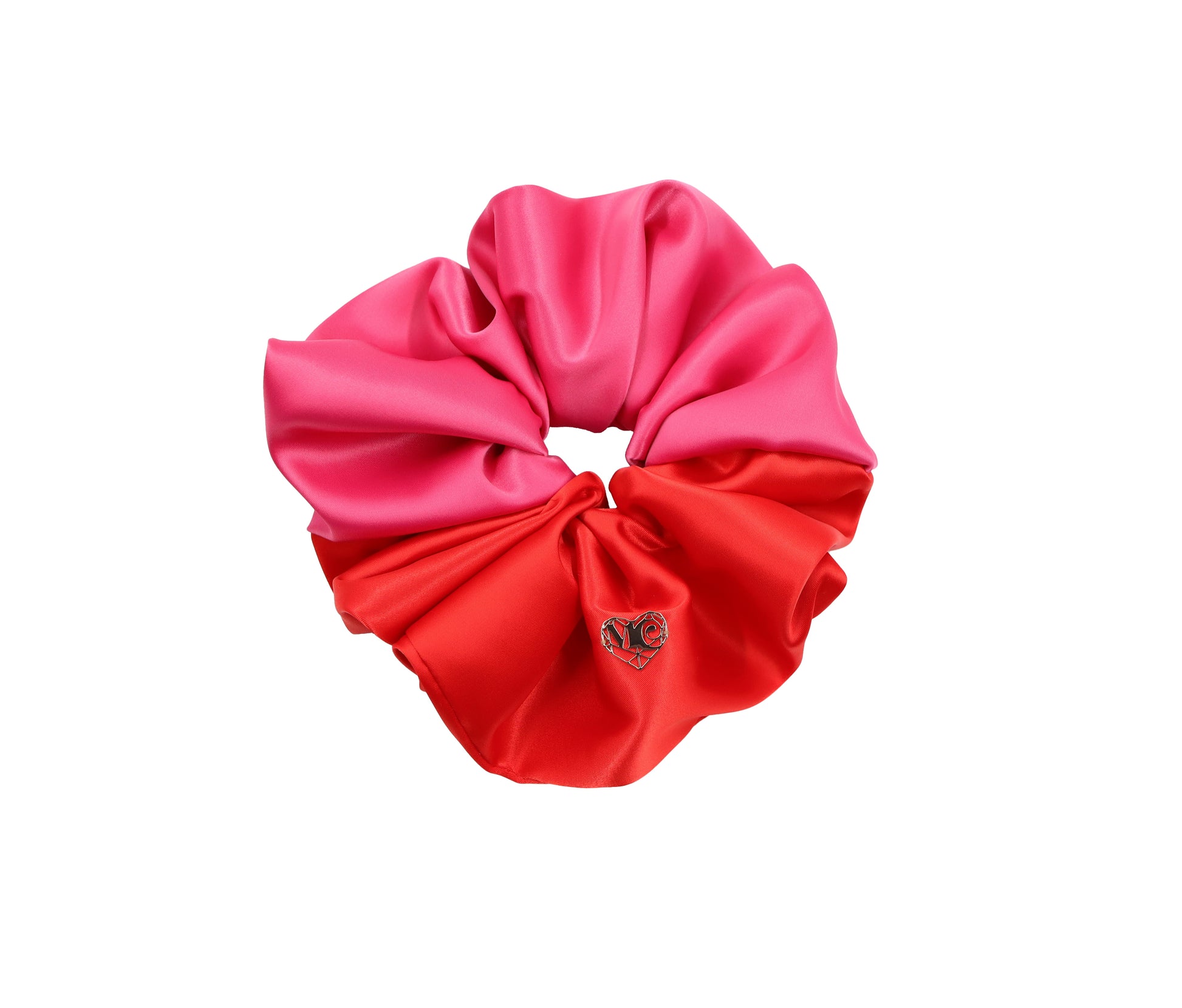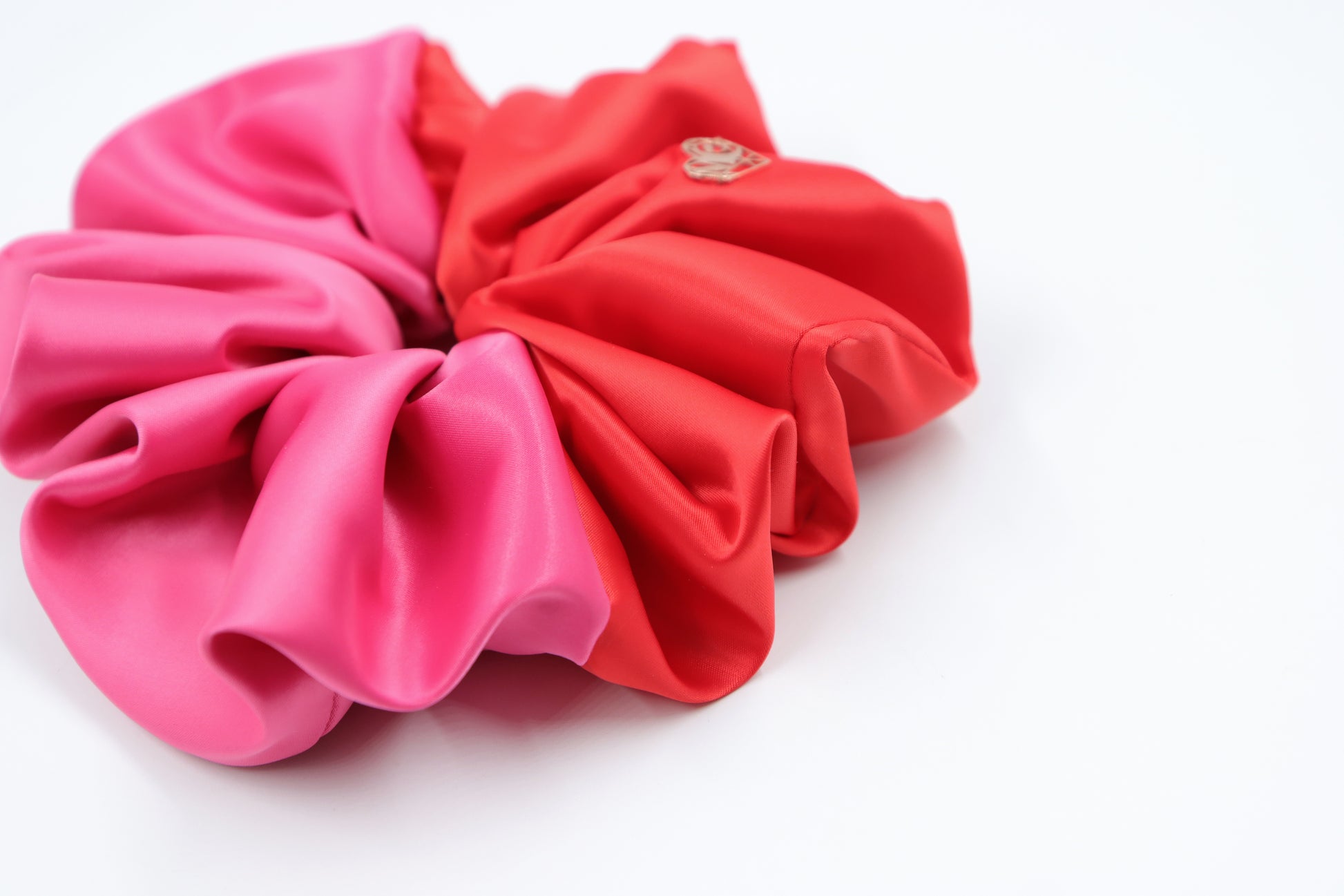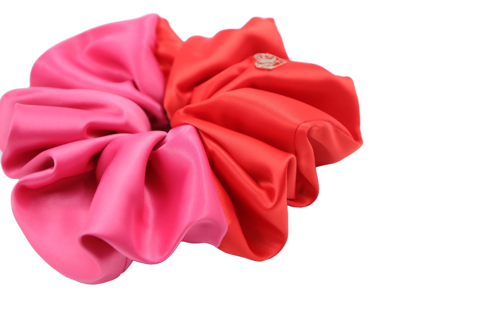 - Oversized colour-block scrunchie in hot pink and red with a Luxe matte satin finish