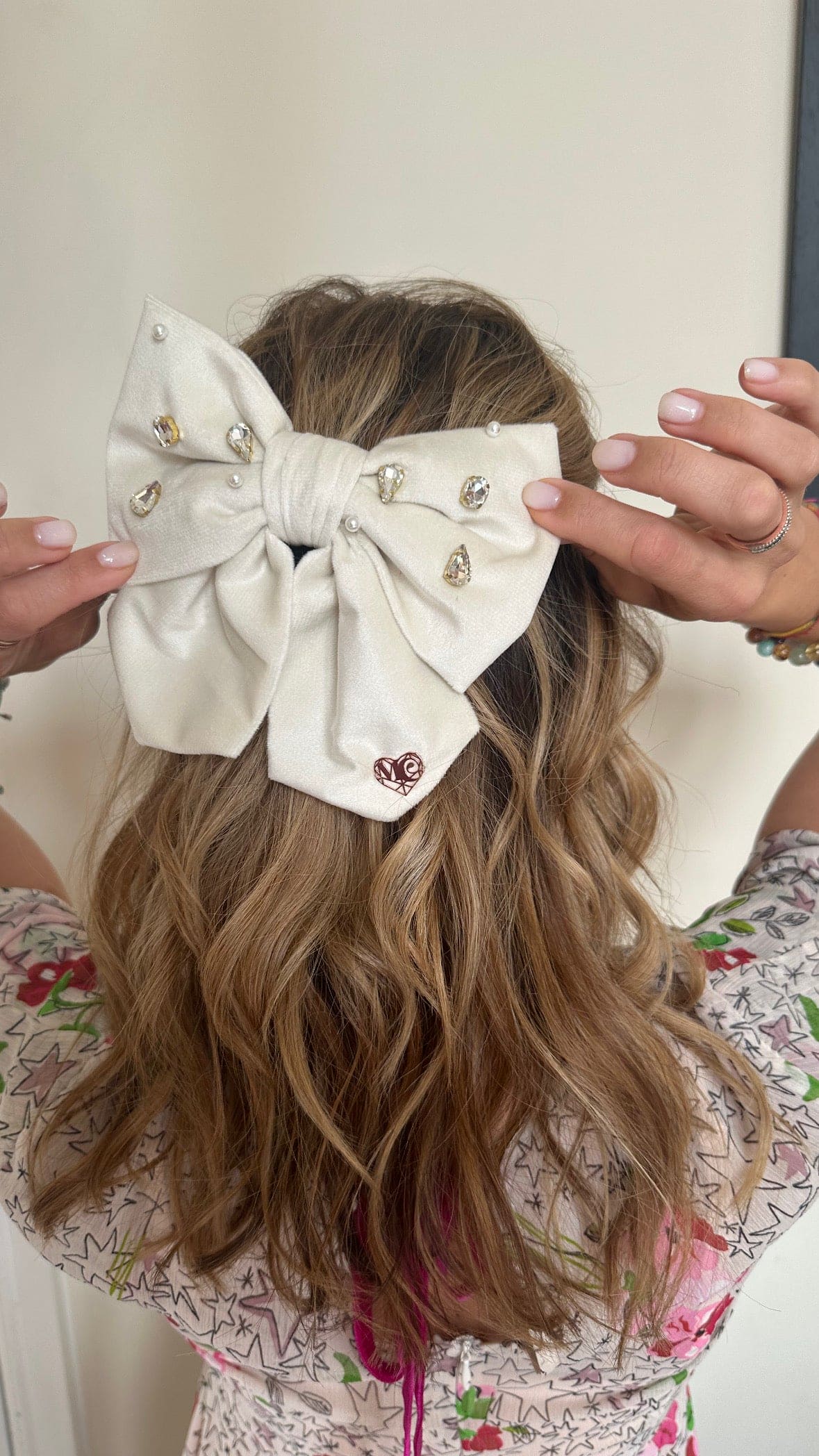 Samanta - Bow Hair Clip Barette - Ivory Velvet with Crystals and Pearls